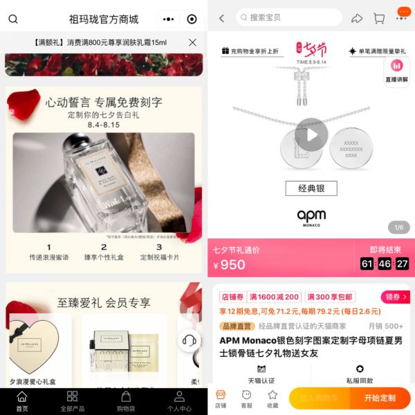 例如YSL在今年七夕主打限定口红礼盒,只要在电商平台消费的用户就可以享受刻字服务,设计过程将在7天内完成。推出类似刻字服务的还有祖马龙香水,APM锁骨链等多个品牌。