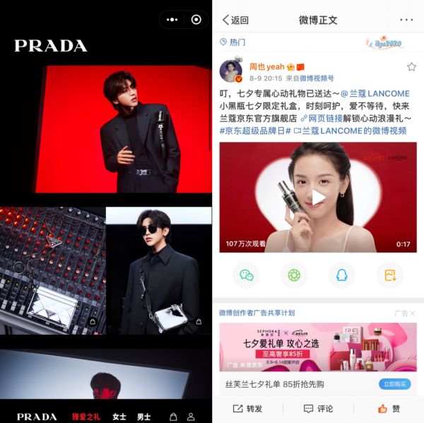 比如巴黎世家在今年七夕携手蔡徐坤推出的广告大片就走了相对简约的时尚风格,而在发布该大片的微信小程序里最醒目的文案则是“臻爱之礼”。兰蔻携手周也拍摄的广告片直接喊出了“上兰蔻京东官方旗舰店”的口号,LV今年七夕Fall In Love 系列香水则请来李佳琦“甄选”古龙香水。