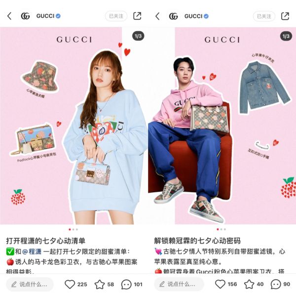 GUCCI在小红书接连发布的宣传文案无一例外都侧重于强调“明星的选择”,比如程潇的七夕礼物清单、赖冠霖的七夕心动密码等等,而这些文案所搭配的广告素材都聚焦于用多款单品做整套穿搭。GUCCI如此做的深意在于为产品打造了特定的消费场景,直接指向转化。
