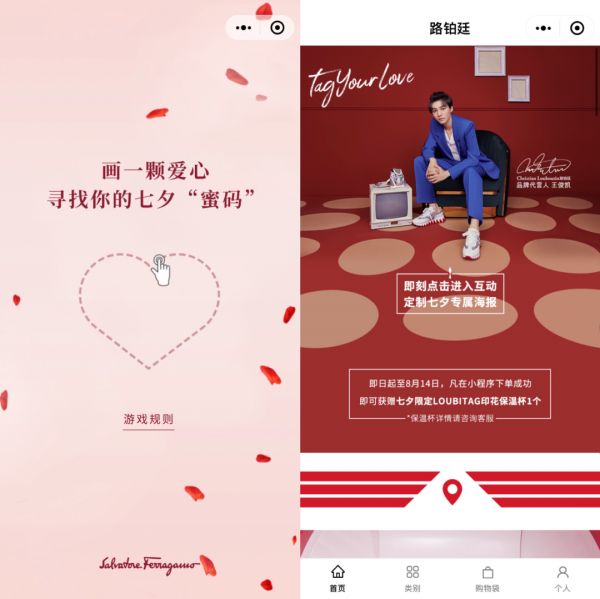 今年七夕,SK-II联合京东打造了线上虚拟城市SK-II CITY,消费者可以在虚拟城市街头闲逛,在虚拟影院观看广告片、了解广告片拍摄的幕后故事,甚至跳转官方旗舰店直接进行购物。菲格拉慕则是在小程序推出了互动抽奖活动,消费者可以通过画“心”来赢得抽奖的机会。路铂廷推出了七夕定制海报的小游戏,用户可以通过拍照,自选贴纸的方式定制个性化的七夕海报。
