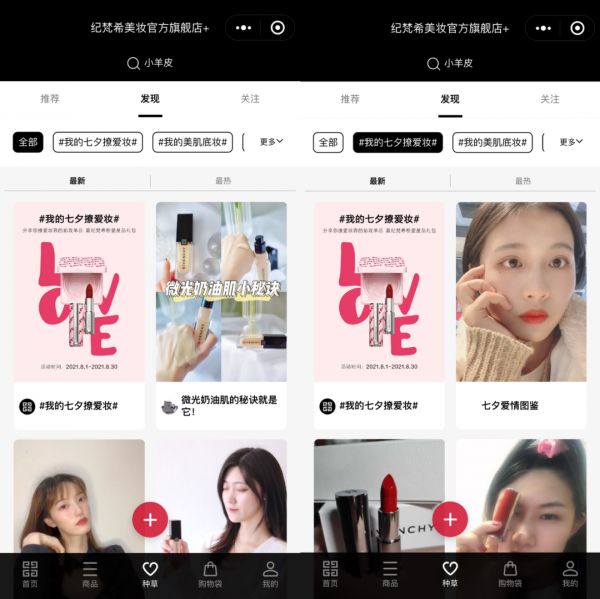 很典型的案例在七夕营销中就能够看到。今年七夕很多品牌都探索了不少全新玩法,比如纪梵希为了推进私域的社交力,特意在小程序的种草专区推出#七夕爱撩美妆话题,消费者可以将自拍、产品心得等发送到小程序中。通过激发用户社交互动感的玩法,纪梵希就能够在小程序内能够构建起“社区”,有效提升用户对品牌的忠诚度以及营销转化效率。