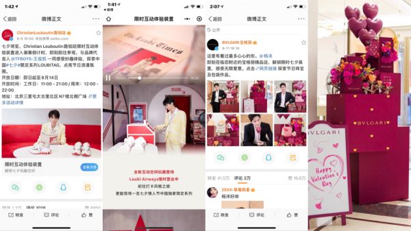 另外,打通线上线下渠道,也是奢侈品牌在推进数字化转型的路程里不断尝试的方式,这也是提升营销效率最为行之有效的手段之一。七夕期间,路铂廷和宝格丽就分别在三里屯、杭州大厦打造了精品体验店,而店铺主要功能就是陈列七夕限定款、品牌形象的包装等等。两者旨在串联多个场景,将线上的销量优势与线下的体验优势结合起来。