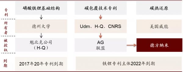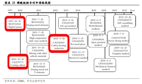 1997 年德州大学Goodenough 教授申请的磷酸铁锂的基础结构和制备工艺专利,并由此延伸了数十个专利;由于磷酸铁锂本身电导率差,用作电池材料需进行改进,关键手段就在于碳包覆,而这一核心技术在2000年被加拿大魁北克水力公司申请;第三项核心专利碳热还原,也被英国企业Valence公司于2000年申请。