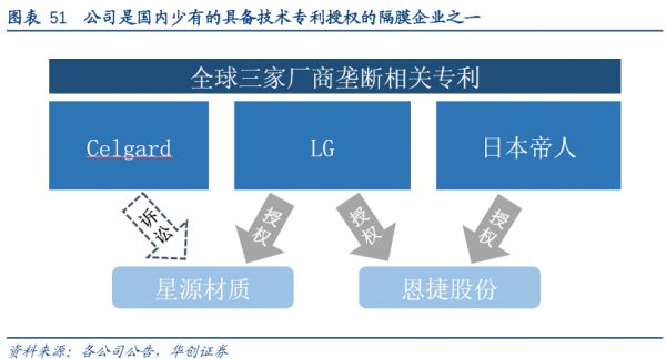 不仅是电解液,还有隔膜核心专利也被紧紧掌握在日韩企业手上。国内两家隔膜龙头,星源和恩捷都是从LG、日本帝人手上得到了专利的授权,而星源在美销售隔膜产品还被全球干法隔膜巨头Celegard(如今被日本隔膜巨头旭化成收购)认为是专利侵权并向法院提起诉讼。