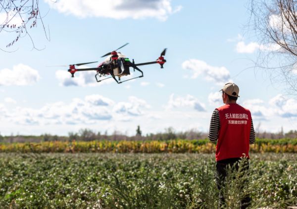 2019年新疆库尔勒,当地农民操作极飞农业无人机为棉花打药除虫。
