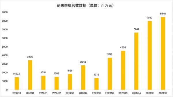 蔚来汽车2021年第二季度总收入约为84.48亿元,同比增长127%,超过彭博分析师预期的83亿元。其中,2021年第二季度汽车销售额为79.11亿元(11.303亿美元),同比增长127%,环比增长6.8%。