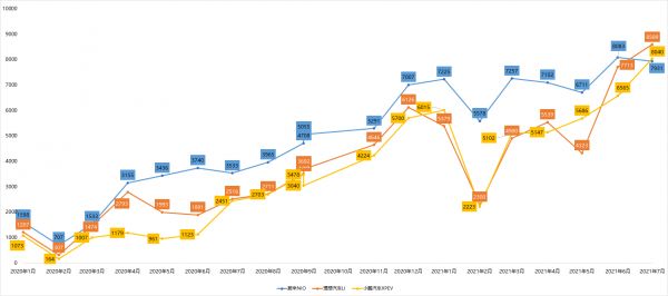 从指引来说,总体上还是比较低的,与之前持平。尤其是蔚来7月的交付数据在继6月创下新高之后,居然又出现了回落。蔚来7月份的交付量为7,931辆,同比增长125%,环比下降2%。从数据来看,蔚来在7月实际上被同行击败了——理想汽车7月交付量达到了8,589辆;小鹏汽车公布的交付量为8,040辆,同比增长228%,环比增长22%。小鹏汽车的交付增速超过了理想汽车和蔚来。