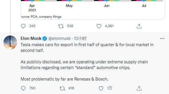 昨天,特斯拉CEO埃隆马斯克也确认了这种说法,他在回应分析师剖析特斯拉7月份中国产汽车国内交付量环比大跌近七成的推文时回答道,“特斯拉在一个季度上半季生产的电动汽车用于出口,下半季生产的才投放本地市场。”