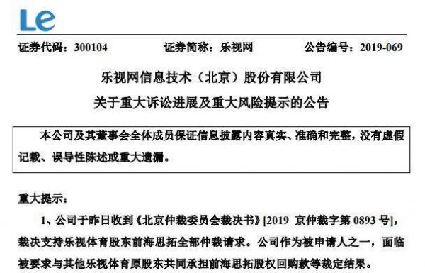 当天,乐视网公告显示,公司收到《北京仲裁委员会裁决书》,深圳前海思拓基金投资合伙企业(有限合伙)向北京仲裁委员会提起仲裁申请,要求被申请人乐视网、乐乐互动体育文化发展(北京)有限公司及北京鹏翼资产管理中心(有限合伙)向申请人支付股权回购款等仲裁请求。
