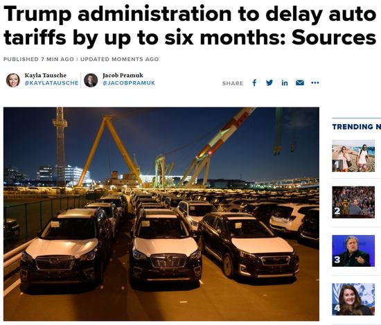 @新浪财经【特朗普推迟征收汽车关税,美欧汽车股飙升】四位消息人士告诉CNBC,特朗普政府计划将汽车关税推迟至多6个月。白宫原定于5月18日的最后期限前决定是否对进口汽车和汽车零部件加征关税。根据法律,特朗普政府还有180天的时间来做出决定,如果它还需要与其他国家的政府进行谈判。特朗普将关税视为在贸易谈判中对欧盟和日本等贸易伙伴施加影响力的一种手段。