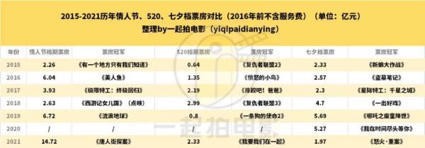 我们也不妨横向来对比一下,来看看七夕档的票房体量如何。
