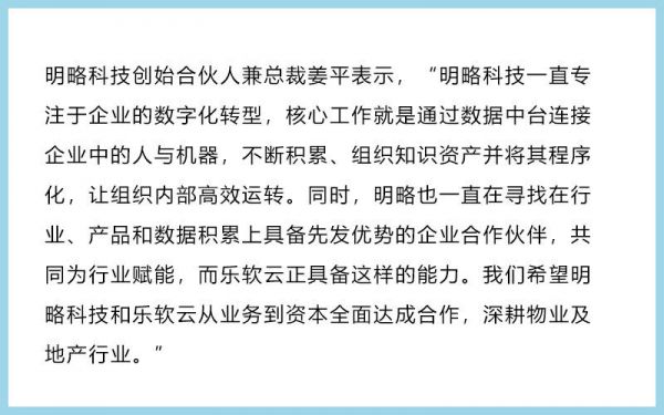 在物业及地产数字化服务领域,要面临从区域到全国范围不同层面的竞争,既有明源云这样的头部上市公司,也有大量的创业公司,甚至还会有免费的SaaS服务。面对复杂的竞争态势,乐软云创始人楚季表示:1)通过产品不断迭代升级,增强客户数据的沉淀,构建数字化服务的数据壁垒,进一步提升客户复购率;2)对于处于头部的KA客户,服务能力是核心,乐软云和明略科技深度合作的智能服务平台,为物业及地产领域带来了数字化核心能力的提升;3)相对于国内巨大的市场空间,目前数字化转型还处于早期阶段,乐软云希望和同业公司一起为客户提供更有价值的产品。