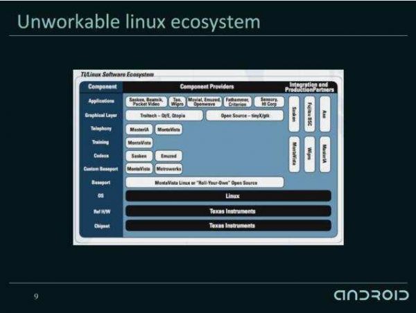 此时,Linux成了“救星”。德州仪器(TI)提供了基于Linux操作系统内核的开放平台。所有制造商需要的只是Linux本身,来自TI的参考硬件,然后是大量的其他模块,制造商必须购买、许可、构建或以其他方式提供这些模块才能创建自己的设备。正如斯威特兰所说:“你可以使用德州仪器的OMAP芯片来制造Linux手机。因此,你需要德州仪器的OMAP,然后需要来自40个不同中间件供应商的40个组件。你把所有这些放在一起,然后把它们集成起来,然后你就有了Linux手机。这太荒谬了!”