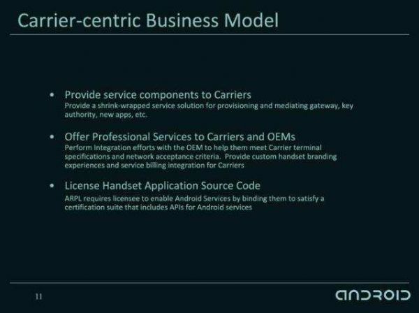 这张幻灯片展示了基于运营商将从安卓获得许可授权服务的盈利之路