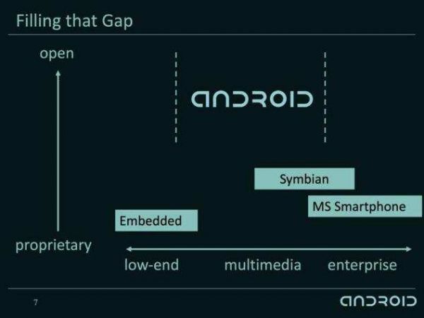 安卓团队展示的第二个要点是,开源平台的市场存在缺口,也蕴含着巨大的机会。也就是说,安卓将是个免费的操作系统,制造商可以通过开源获得。公司将能够在自己的手机上使用和分发这个操作系统,而不需要受制于软件提供商,也不需要自己构建。这种开源方法在当时还未出现。