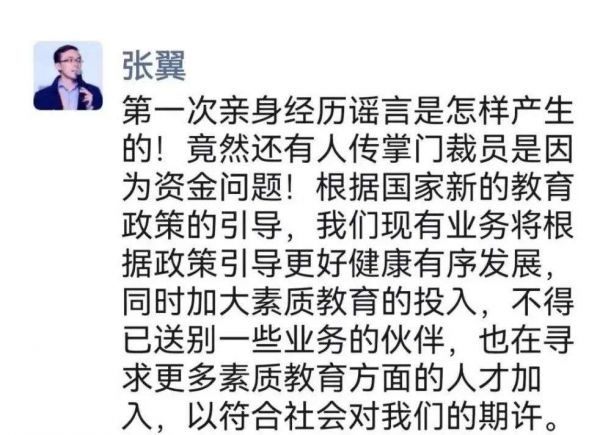今年7月末,网 传掌门教育“因为资金问题裁员”,该公创始人张翼在朋友圈“辟谣”称将基于政策加大投入素质教育: