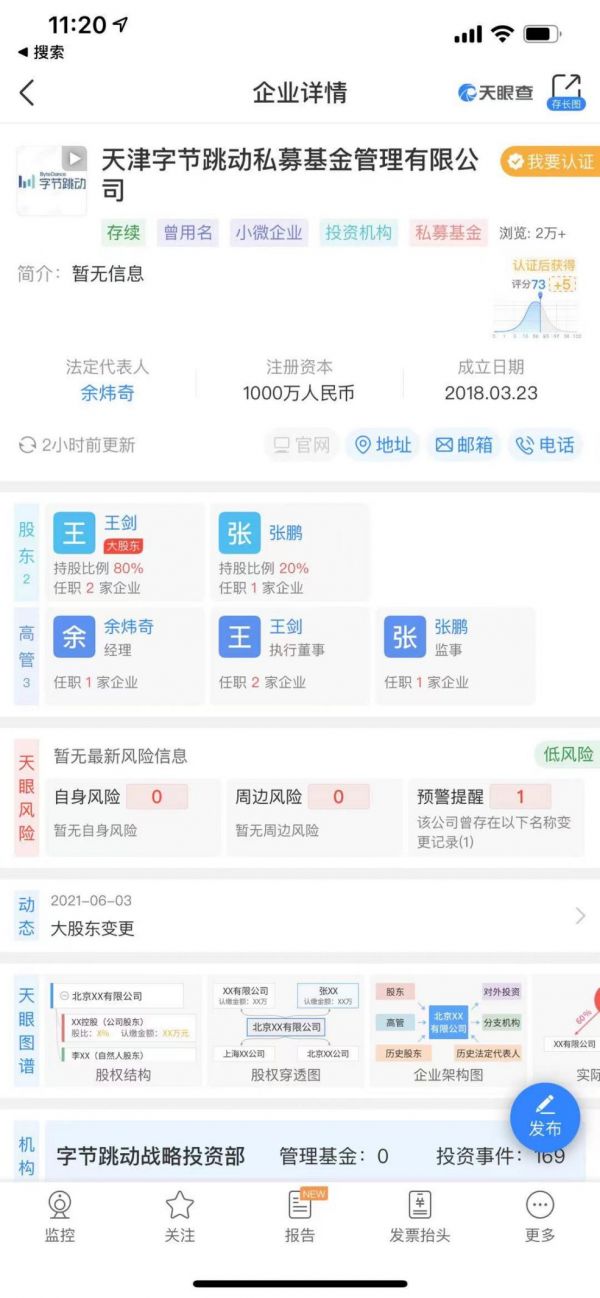 资料显示,天津字节跳动私募基金管理有限公司成立于2018年3月,由张利东和张一鸣共同发起并持股,其中张一鸣曾持股80%。目前,字节私募管理公司的大股东为王剑(持股80%),共同持股人为张鹏。