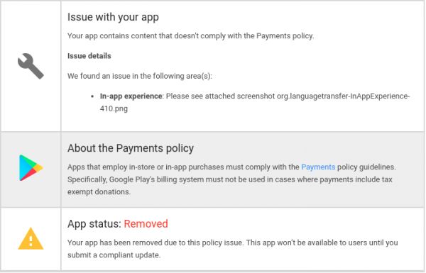 Mihalis Eleftheriou 有些委屈,他认为谷歌为了一些非营利组织可以破例不收取抽成,但 Language Transfer 只是由他一个人经营的小项目,即便通过那个 Patreon 链接进行捐赠只是支持开源项目的一种表达方式,谷歌也一定要从中抽成。