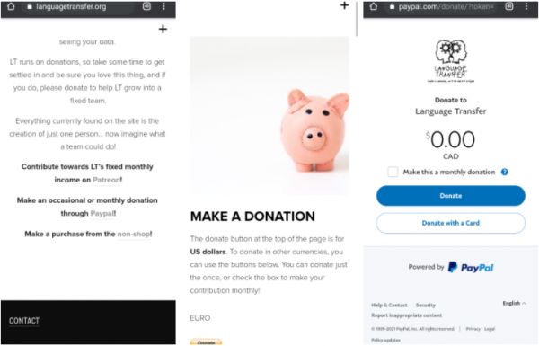 通过这些截图可以明显看出,应该是谷歌的某个审查人员访问了 Language Transfer 中链接的官网,划到了页面最底部,又通过两次点击找到了为该项目提供资金的方法,因此将 App 整个下架了。(注:这并非开发者后期更改的,早在谷歌首次批准 Language Transfer 上架时,这个链接就已经存在了。)