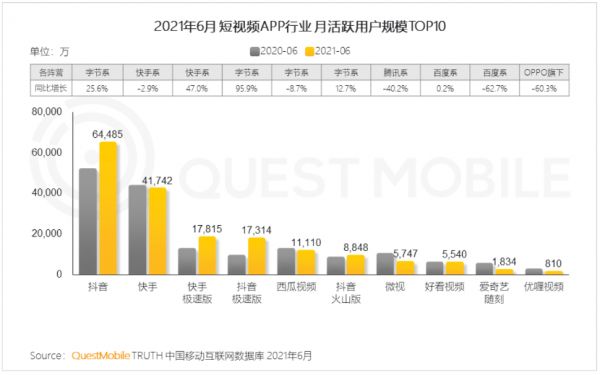一个最直接的结果,就是用户增速的变化。根据QuestMobile近期发布的《中国移动互联网2021半年大报告》显示:截止今年6月,快手的MAU为4.1亿,同比出现了2.9%的下滑。