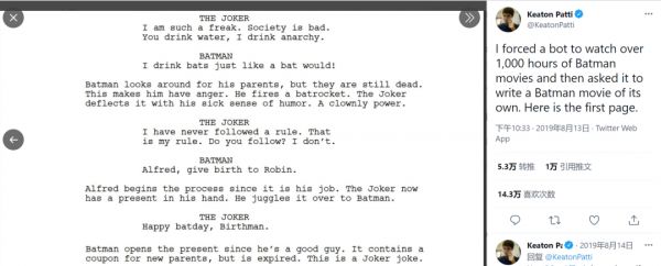 2019年,DC漫画公司的一名粉丝 Keaton Patti 使用AI创作了《蝙蝠侠》电影剧本,并将其发表在了推特上,谁承想,剧本一经发布就引来无数围观,因为 AI“创作”的奇葩台词实在是太可笑了。