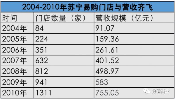2004-2007年是苏宁电器增速最快的几年,门店数从84家激增到632家;营收也从91.07亿元暴涨至401.52亿元,每年的营收同比增速保持在50%以上。