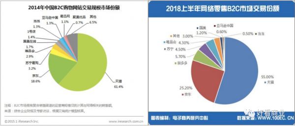 据艾瑞的统计,到2014年时,苏宁在国内B2C电子商务领域已经占据3.2%的份额,仅次于天猫、京东,位居第三。这种格局一直持续到2017年。