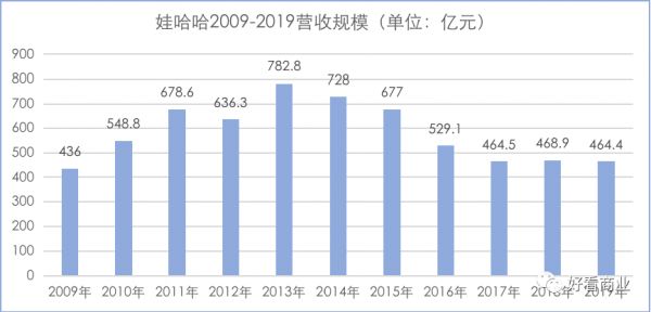 2013年,娃哈哈营收达到历史顶点782.8亿元后,营收持续下滑;2018成为近年营收同比增长的年份,仅较上年增加了4.4亿元。
