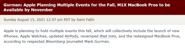昨天(8月15日)晚上,知名苹果爆料人、彭博社记者马克.古尔曼 (Mark Gurman) 在彭博社最新的“Power On”时事通讯中表示,苹果计划在今年秋季举办三场发布活动,其中首场发布会预计将在9月上旬举行。考虑到这位爆料者的过往爆料准确度,该消息还是具有一定可信度的。