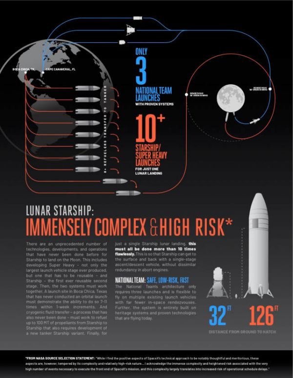 NASA只选择SpaceX执行登月任务,这一决定令人感到惊讶。该机构的官员曾表示,他们希望“至少选择两家承包商”,以便在开发过程中进行竞争,同时做到以防万一。但NASA后来表示,美国国会没有拨出足够的资金来支持授予两份合同。在由此引发的抗议中,蓝色起源和Dynetics认为,NASA应该修改项目条款,因为很明显,它只有授予一份合同的预算。此外,抗议中认为,NASA与三家公司中出价最低的SpaceX就最终竞标价位进行了不正当的谈判。