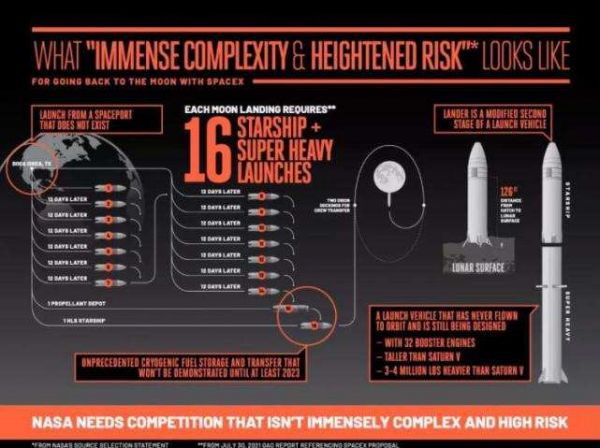因此,蓝色起源回到了它过去使用的策略,当时它批评NASA偏袒SpaceX,通过联邦机构反对NASA的决定。当这条路线再次被证明是一条死胡同时,蓝色起源接着在媒体上发起了一场公关运动,批评星际飞船在执行月球任务时“过于复杂、风险太高”。自然,马斯克在推特上做出了回应,驳斥蓝色起源的错误说法,并指出SpaceX成功执行了多次国际空间站任务。