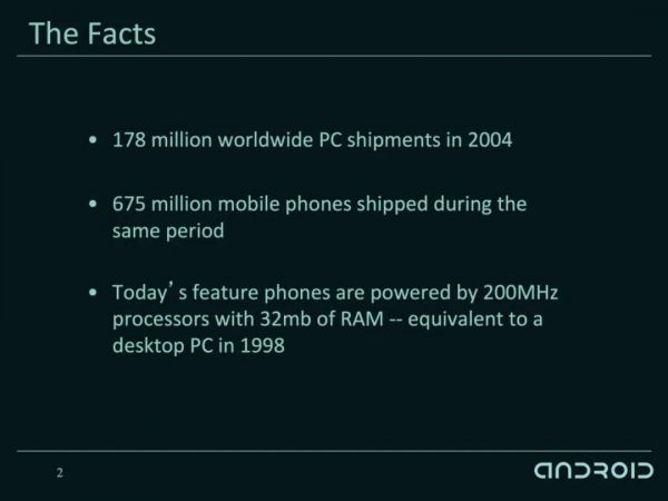 据外媒 ArsTechnica 报道,Android 初创团队于 2005 年 3 月对投资者演示的 PPT 一共有 15 张,而这些内容足以吸引 VC 和 Google 的注意。在 PPT 中,Android 团队首先分析了彼时互联网硬件市场的发展现状,2004 年,个人电脑出货量为 1.78 亿台。同期,手机出货量为 6.75 亿部;几乎是 PC 数量的四倍,但处理器和内存的功能与 1998 年的 PC 一样。