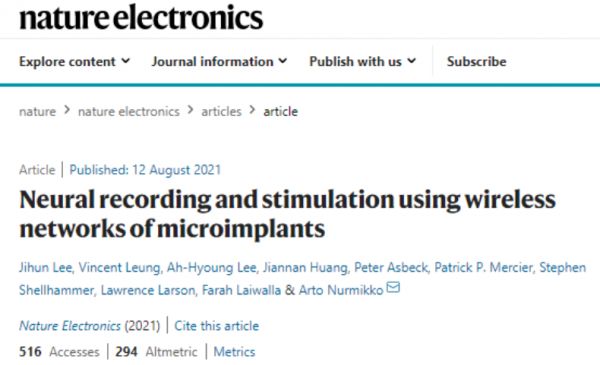 团队表示,这款内外呼应的脑机接口系统,不但能读取和翻译神经信号,还能反向刺激大脑的神经活动,实现脑机接口的双向控制。8月12日,论文以 Neural recording and stimulation using wireless networks of microimplants 为题目的发表在 Nature Elecotronics 期刊上。