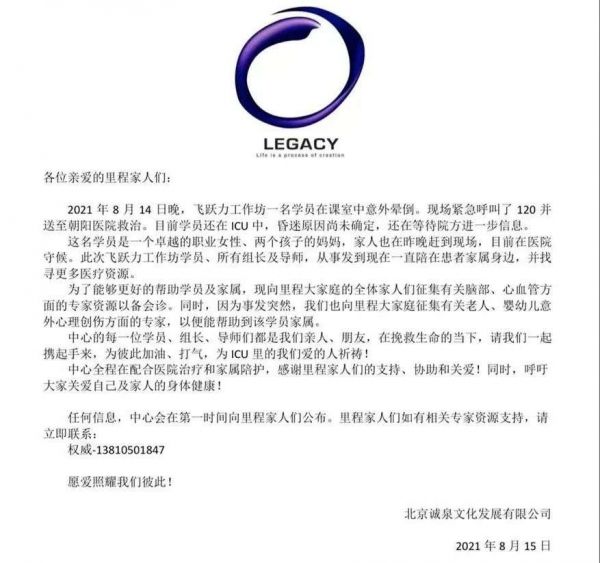 这则信息在课程主办方诚泉文化官方公众号的一封求助信上也得到了部分证实,8月15日当天的推文中透露一名卓越的职业女性、两名孩子的妈妈在课室中意外晕倒。晕倒原因尚未确定,在现场呼救120后,送往北京朝阳医院救治。