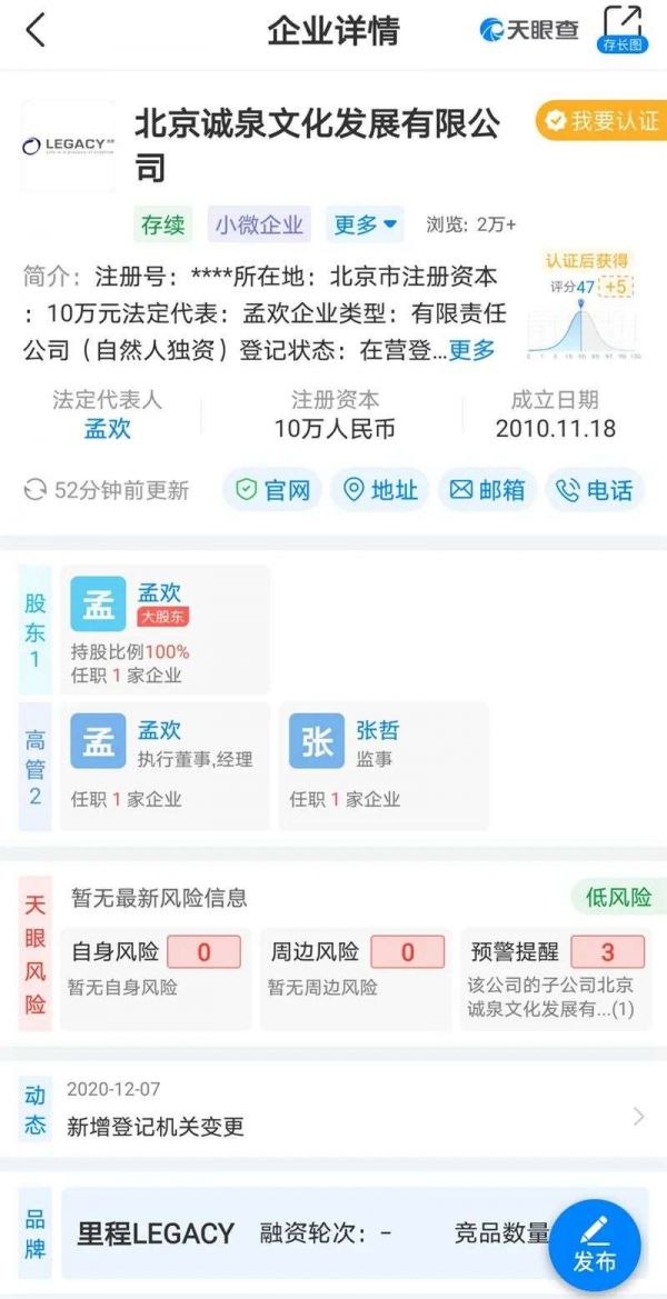 在对外宣传中显示,诚泉文化是一家由2000年开始香港服务华人的社群,在2003年拓展了深圳、广州及北京中心。其中根据天眼查显示,北京诚泉文化发展有限公司成立于2010年,其法定代表人为孟欣,公司参保人数13人。