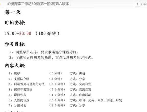 曾于2018年5月曾参加过诚泉文化工作坊的王健(化名)向猎云网表示,诚泉文化的课程基本是固定的,主要分为四个阶段“探索、蜕变、里程、大师”。其中讲师煽动能力较强,根据设定的环节引发学员情绪,在2018年期间上课时间均为下午六点到晚上十二点。
