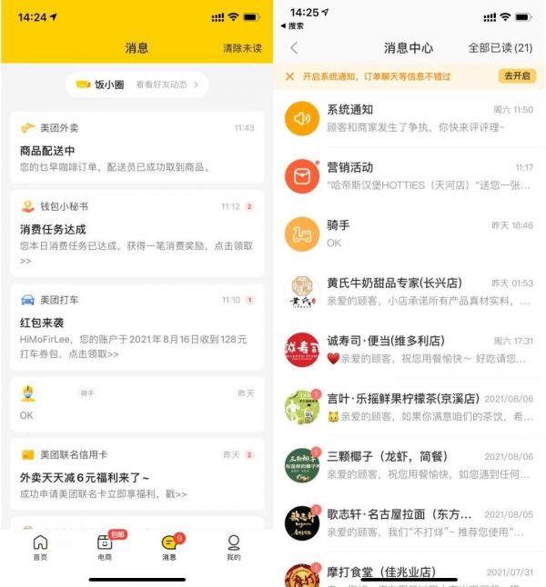 需要注意的是,饭小圈只能通过美团App中的信息界面进入,暂不支持美团外卖App。这就有点说不通了,按道理,饭小圈是一款外卖分享平台,美团外卖App理应设立该功能的入口。至于美团外卖App为什么无法直接进入饭小圈,可能该功能处于内测阶段暂未开放吧。