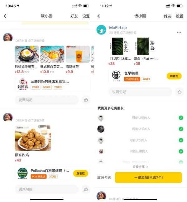继美团推出“商家群聊”后,美团又一次围绕外卖搭建了新的社交体系,该功能于今年7月开启内测,名为“饭小圈”,是一款基于微信好友和通讯录好友的外卖分享平台。