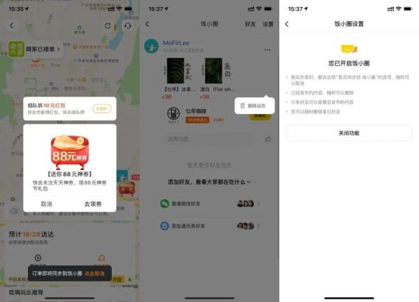 其次,饭小圈允许用户在两分钟内取消外卖订单分享,取消按钮一般会出现在用户成功下单后。如果用户错过了取消分享的机会,不用担心,美团提供了两种备选方案,一种是直接在分享界面删除该动态;另一种则是用户可以在设置界面中选择关闭饭小圈。