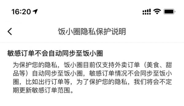 最后,饭小圈隐私保护协议显示,敏感订单不会自动同步至动态界面,比如出行订单、情趣用品、药物信息等。美团承诺,饭小圈只会自动分享美食、甜品等相关内容。