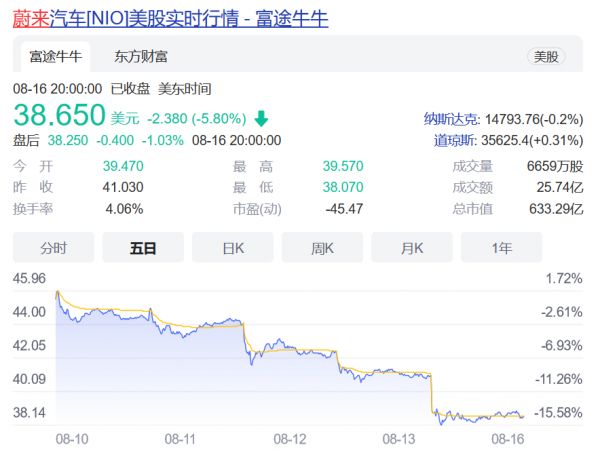 自动驾驶概念面临来自舆论和监管的双重审视,特斯拉及新能源汽车中概股股价同时受挫,其中蔚来股价报收38.62美元/股,跌幅为5.87%。