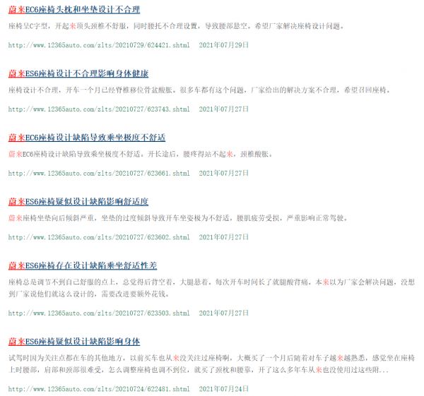 在车质网投诉平台上,7月以来关于蔚来汽车座椅问题的投诉多了起来,被质疑为设计缺陷。有车主反映“座椅腿部上翘过大,对于腰部的支撑不足,腰椎压力过大,容易造成腰部损伤”,甚至还有车主晒出了医院的CT检验单。
