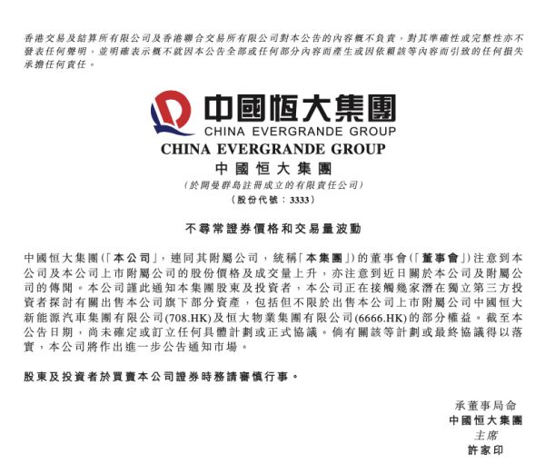 8月10日,恒大集团发布公告称,“正在接触几家潜在独立第三方投资者探讨有关出售本公司旗下部分资产”,提到的“部分资产”就包括恒大汽车。
