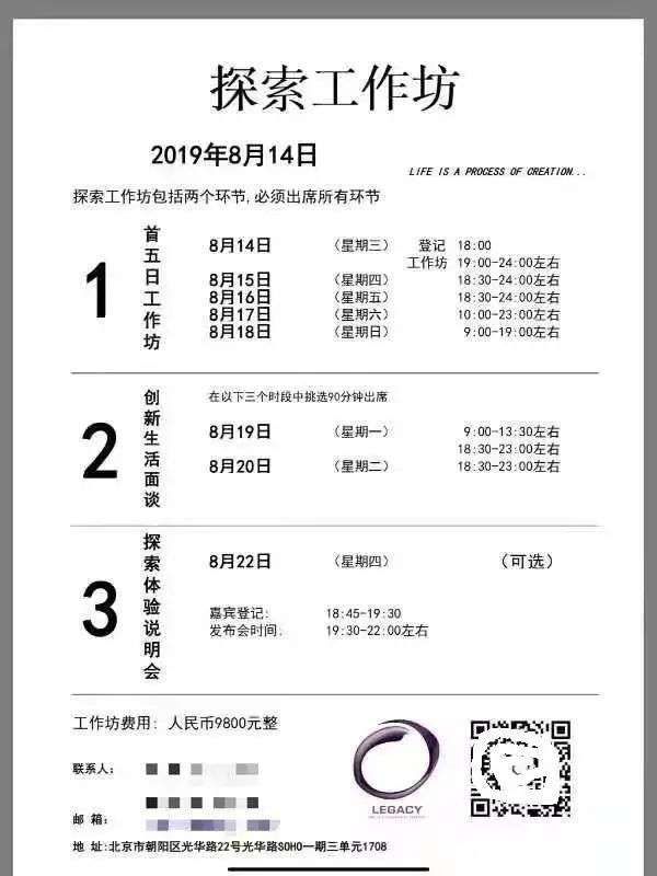 郭声参加深圳的LEGACY工作坊时,到第二阶段飞跃力(蜕变)的时候退出了。“我刚参与的前2个小时非常抵触,我在分析讲师每一句话背后的套路,以及他们的商业模式,我感觉他们在骗我钱”。