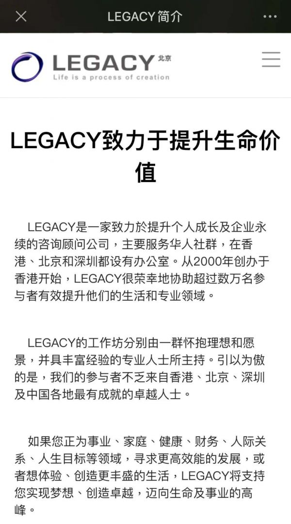 官网资料显示,该公司是一家致力于提升个人成长及企业永续的咨询顾问公司,主要服务华人社群,在香港、北京和深圳设有办公室,“协助过数万名参与者有效提升他们的生活和专业领域”。