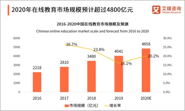 据艾媒数据报告统计:2020年中国在线教育用户规模将达到3.51亿人,2020年受疫情影响,在线教育需求得到激化,包括传统院校均尝试使用线上课程来保证教育计划的推进。