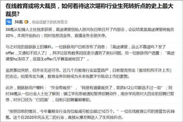 近些年,培训机构在市场上多次传出“虚假宣传”、“裁员”、倒闭等事件。近日脉脉用户爆料:“作业帮裁员”,“网易有道要裁员了,果然K12公司都逃不过一劫”。