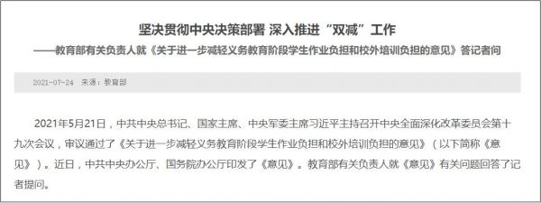 中共中央办公厅、国务院办公厅近日印发《关于进一步减轻义务教育阶段学生作业负担和校外培训负担的意见》,如下图所示: