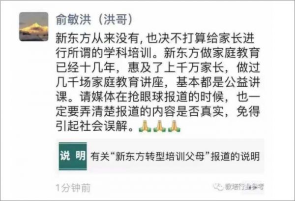 近日,新东方创始人俞敏洪在朋友圈声明否认了给家长进行所谓的学科培训,其实“学科培训”只是做家庭教育。