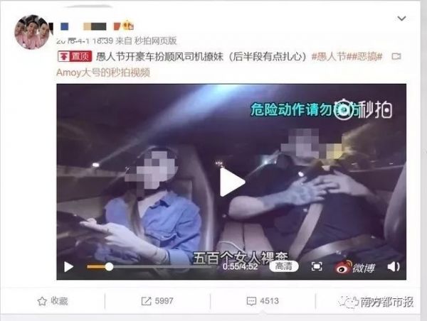 记者注意到,部分视频中车主存在危险动作。如在2018年4月1日发布的一则名为“愚人节开豪车扮顺风车司机撩妹”的视频中,视频时长近5分钟,大部分时间内司机仅单手握方向盘,部分片段中甚至双手撒开。视频中,右上角则打出了“危险动作请勿模仿”的字样。